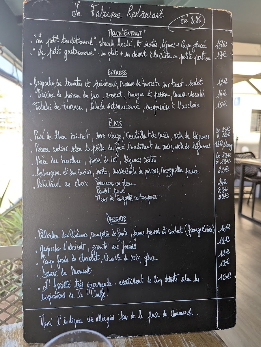 Welcome to La Fabrique Restaurant, a hidden gem nestled on the bustling main road along the scenic coast of Le Grau-du-Roi, France. This charming venue is managed by a trio of dedicated young women who pour their creativity and passion into every dish. From the moment you walk through the door, you’re enveloped in a cozy atmosphere, adorned with thoughtful details like blackboards showcasing the daily menu, vibrant cactus plants, and individual pots of fleur de sel from the Camargue at each table.